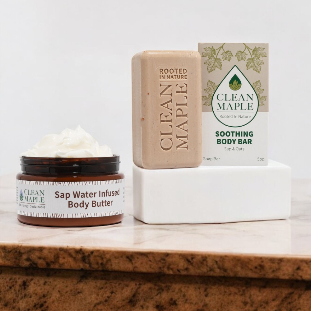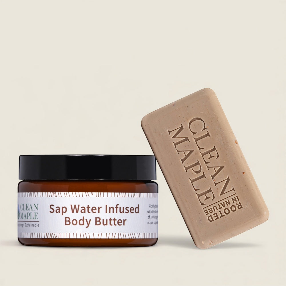 Escape to the quiet peace of Vermont’s woods. This comforting duo begins with our Soothing Body Bar, offering a creamy, calming lather that leaves skin soft—not stripped. Follow with our rich Body Butter, infused with maple sap water, hyaluronic acid and organic shea butter to hydrate and smooth.