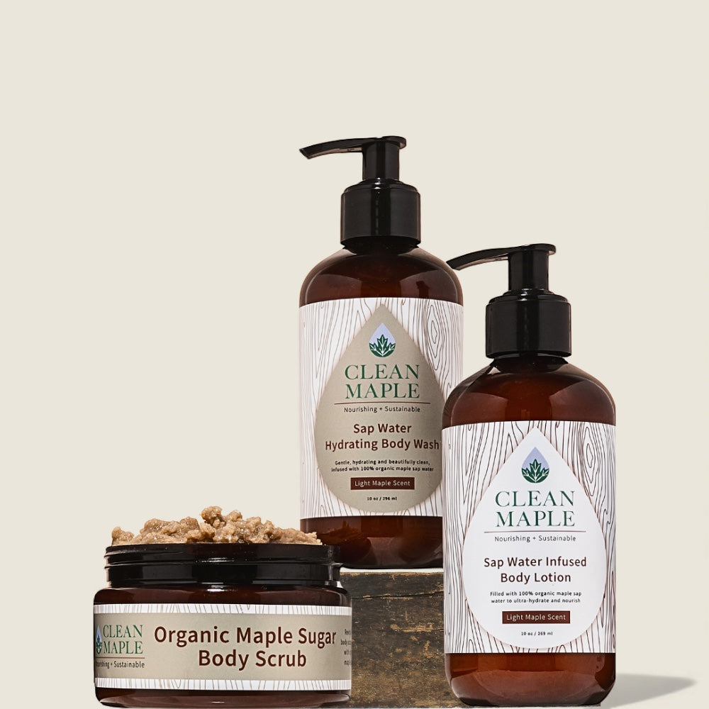 Bring the essence of Vermont’s forests to your daily ritual. The Vermont Essentials trio — featuring our Hydrating Body Wash, Maple Sugar Scrub, and bestselling Body Lotion — delivers the full Clean Maple experience. Gently cleanse, polish, and hydrate with nature’s purest ingredients for soft, balanced, radiant skin.